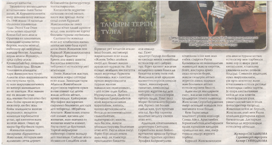 Сыздықова, Жұмакүл. Еңбегі ерен, өмірі өнегелі жандар [Мәтін] : Еске алу кешінде тебіреніске толы естеліктер легі ағытылды / Жұмакүл Сыздықова ; Суретті түсірген Қамар Сүйіндікова // Әулиекөл. – 2025. – 27 қараша. – Б. 4.