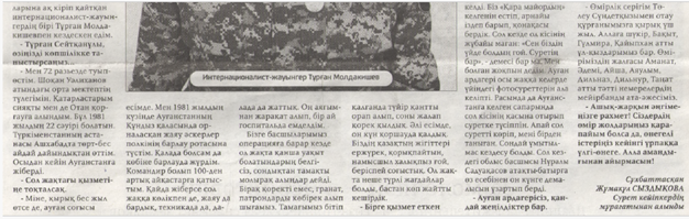 Есімде Ауған соғысы [Мәтін] : «Біздің қазақ – ержүрек, қорықпайтын, намысшыл халықпыз», - деп еске алады сол бір жылдарды кейіпкерім / Сұхбаттасқан Жұмакүл Сыздықова ; Сурет кейіпкердің мұрағатынан алынды // Әулиекөл. – 2026. – 12 ақпан. – Б. 3.